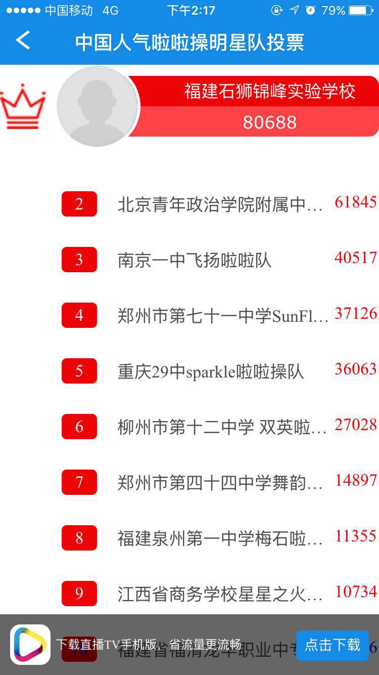 此外,伴随着公开赛的落幕,2015-2016年全国啦啦操联赛总决赛(中学、大学、俱乐部丙组和丁组)的最佳人气奖队伍的投票活动也正式结束。最终获得前三名的队伍分别是:福建石狮锦峰实验学校80688票,北京青年政治学院附属中学舞动传奇啦啦队61845票,南京一中飞扬啦啦队40517票。获奖队伍可联系全国啦啦操委员会竞赛部相关工作人员领取奖品哦!