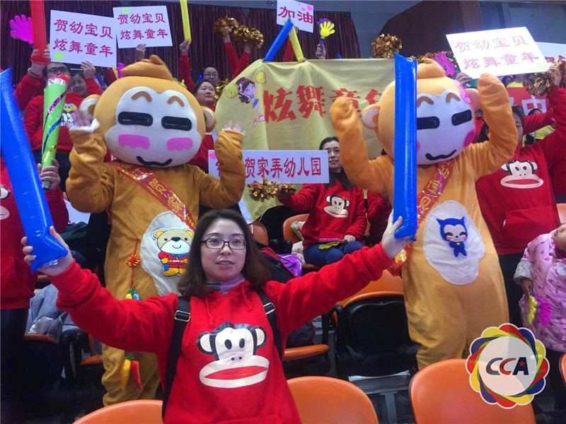 赛场上,很多看台啦啦操队伍非常庞大,其中镇江市京口区贺家弄幼儿园炫舞童年啦啦操队的人数最多,将近有40名家长,为了创新,他们把毛绒的移动玩偶带上了看台,玩偶的扮演者是孩子的妈妈和奶奶,她们全程待在毛绒玩偶里面,站在看台上为所有的队伍加油,他们这种自我牺牲,无私奉献的大无畏精神感染了在场的观众和运动员,这也正是我们啦啦操想要传递给大家的正能量。对于孩子而言,他们比赛的全程都有父母的参与,这种鼓励胜过千言万语。
