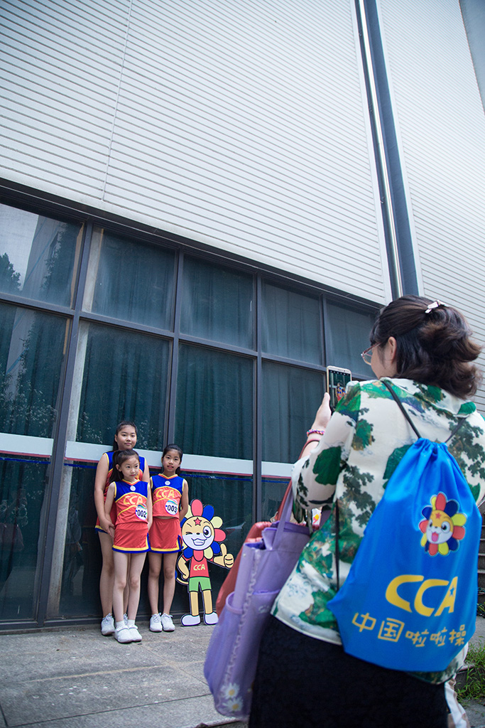 在雨后闷热天气中,小小啦啦操运动员为能顺利考级成功,把握时间加紧自我复习,场外的家长们也都关心着孩子们的表现。