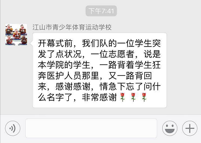 7月13日晚,小编收到了这样一段消息:开幕式前,我们队的以为学生突然发生了一点状况,一名志愿者,说是本学院的学生,一路背着学生狂奔医护人员那里,又一路背回来,感谢感谢!情急下忘了问什么名字了,非常感谢!!!