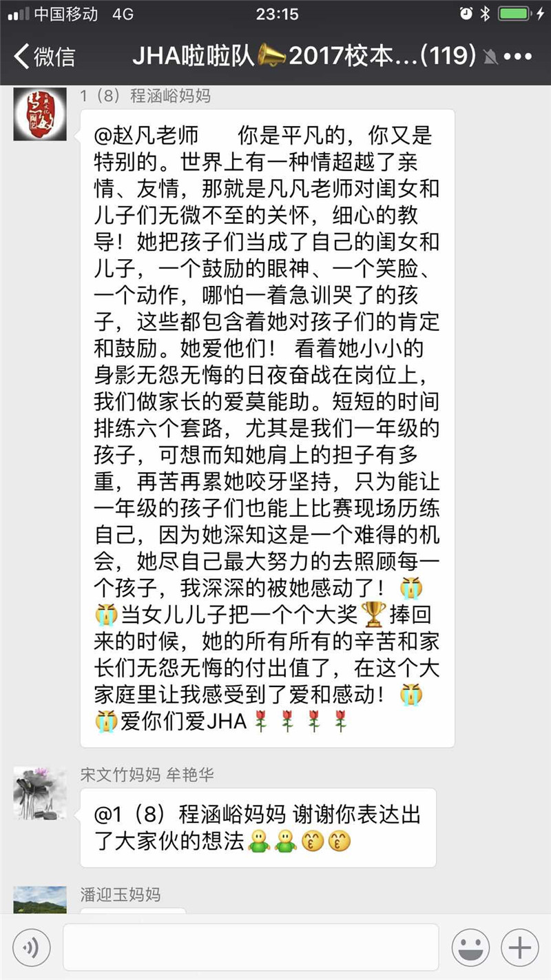 啦啦操也是一项培养队员自信心的运动,如下是一位孩子家长对老师所说:“迎玉是个慢热的孩子,不论是学习还是别的,因为没怎么学舞蹈,基本功不扎实,所以,她对自己缺少信心。考试前一段时间因为落下一段课程,学习很吃力,我跟她说,要不咱啦啦操停一段时间?她一听立马就哭了,跟我说,如果我不在啦啦操队,我在班里就啥都不是了。凡凡老师,你不知道我当时的心情,真的感到心很疼,很疼,疼的喘不过气来!啦啦操几乎是她唯一的自信来源啊!你对他的重要性不可言喻”。啦啦操给了孩子们无尽的自信心,让他们可以更加的肯定自己,对自己,对未来充满信息。